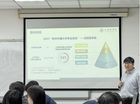讲座中,杨主任围绕软科排名体系、学校整体表现、专业建设现状、核心提升策略四大维度展开系统解读。他详细介绍了软科中国大学排名10大评价模块、37个维度、104项指标的构成逻辑,结合2025年最新数据,全面分析了我校在软科医药类大学排名、全国主榜的进位成效,重点拆解了办学层次、学科水平、人才培养、科学研究等模块的得分与位次差距。